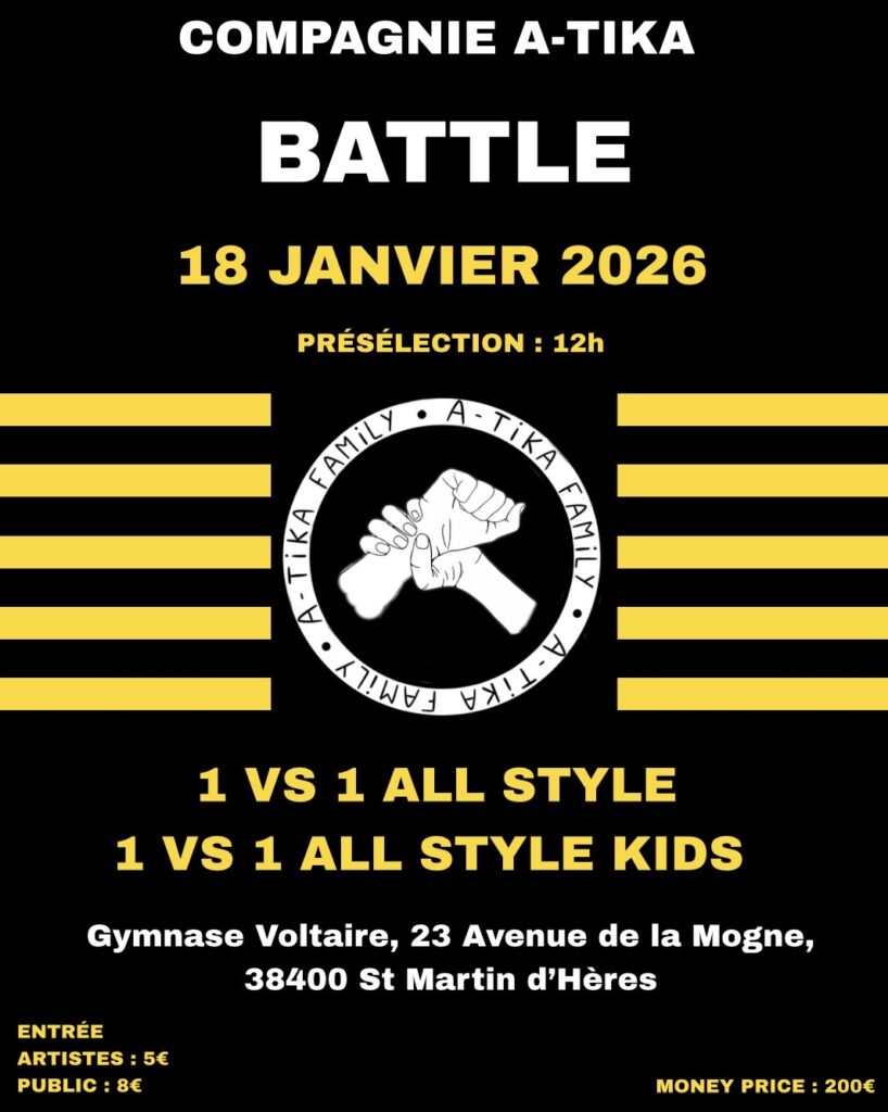 Le dimanche 18 janvier prochain a lieu la BATTLE ALL STYLE de l’association A-tika à Saint-Martin d’Hères.